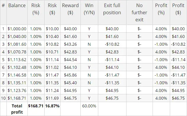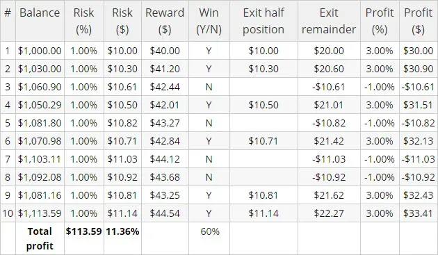 We take a 10-trade sample of a system that has a win rate of 60% with a risk ratio of 4:1. This system requires us to exit half of our position when our profit doubles risk, i.e. at +2%. The remainder of the position closes at the target of 4 times our initial stop loss (plus spreads and blah blah, I know).